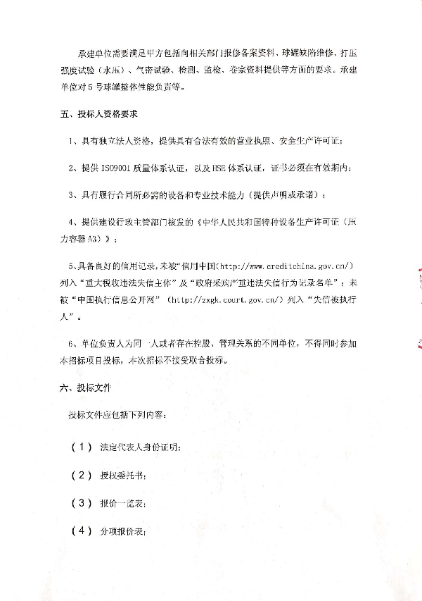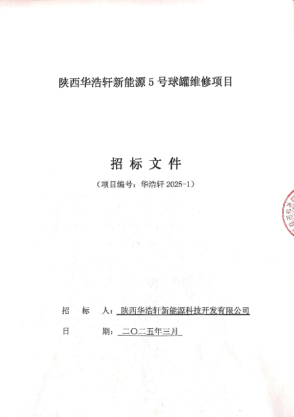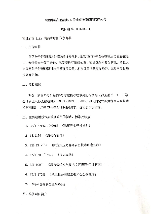 陜西華浩軒新能源科技開發(fā)有限公司5號球罐維修項目招標(biāo)文件